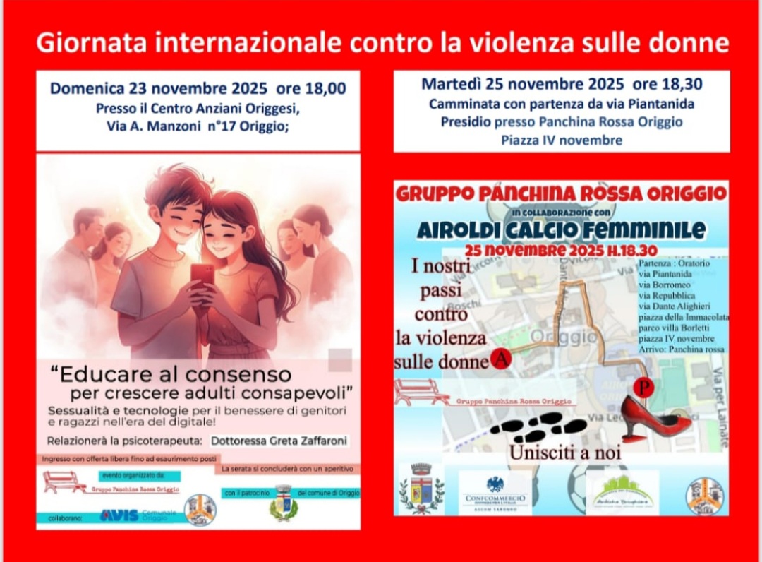 La Proloco Origgio con la collaborazione del gruppo Panchina Rossa organizza una conferenza della psicoterapeuta dott.sa Greta Zaffaroni con la presentazione del libro “Educare al consenso per crescere adulti consapevoli” in occasione della Giornata internazionale contro la violenza sulle donne